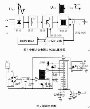 中頻逆變直流電阻焊機的供電電源是由三相工頻交流電源經(jīng)整流電路和濾波電容轉(zhuǎn)換成直流電源,再經(jīng)由功率開關(guān)器件組成的逆變電路轉(zhuǎn)換成中頻方波電源,然后輸入變壓器降壓后,經(jīng)低管壓降的大功率二極管整流成直流電源,供給焊機的電極,對工件進行焊接(見圖1)??刂齐娐凡糠钟蒁SP和CPLD組成,DSP(TMS320LF2407A)產(chǎn)生的PWM波和檢測信號、保護信號在CPLD(EPM7128S)里現(xiàn)實邏輯運算。