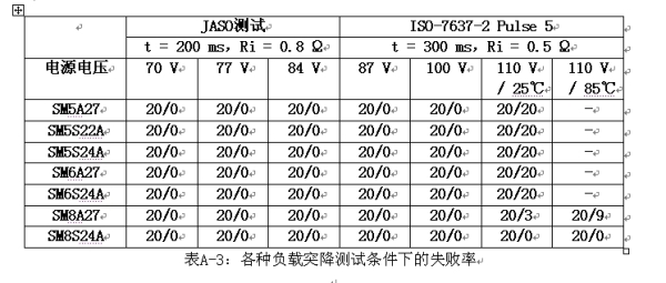 表A-3所示為Vishay的負(fù)載突降TVS在各種負(fù)載突降測試條件下的失敗率。SM8S24A是ISO-7637-2 Pulse 5測試最大額定值條件下最強大的器件。