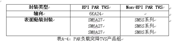 Vishay有兩種類型的汽車電子初級保護負(fù)載突降TVS:EPI PARTVS和Non-EPI PARTVS。PAR TVS的產(chǎn)品組列在表A-4當(dāng)中。