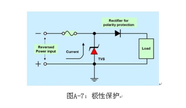 大電流應(yīng)用極性保護的一種解決方案是使用高正向電流能力的整流器,或者是在電力線中使用沒有極性保護二極管的負(fù)載突降TVS,如圖C-10所示。