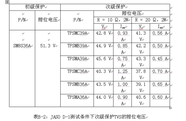 在24 V測試條件下,初級保護TVS的擊穿電壓如表B-1所示。這些將導(dǎo)致在穩(wěn)壓器、儀表總成集成電路和其他電子設(shè)備上出現(xiàn)高電壓。