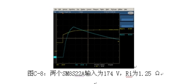 至少,兩個串聯(lián)的SM5S22A箝位負(fù)載突降電壓輸入為174 V,線路電阻為2 Ω,而SM6S22A或SM8S22A具有更低的箝位電壓和更低的線路電阻。