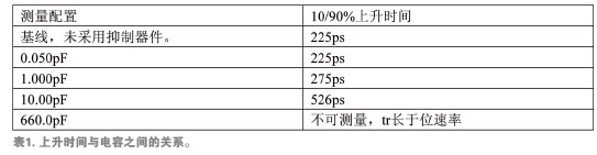 上升和下降時(shí)間較慢會(huì)給系統(tǒng)帶來一些問題,其中最重要的是時(shí)序問題。電路在特定的時(shí)間需要穩(wěn)定的“高”態(tài)和“低”態(tài)。隨著各狀態(tài)之間過渡時(shí)間的增加,電路有可能檢測(cè)到不完整的過渡期,從而將數(shù)據(jù)誤差引入系統(tǒng)。表1是不同寄生電容ESD抑制器件對(duì)數(shù)據(jù)上升沿時(shí)間(10%至90%高電平)所造成的影響比較。