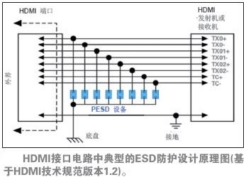 圖6.HDMI接口電路中典型的ESD防護(hù)設(shè)計(jì)原理圖(基于HDMI技術(shù)規(guī)范版本1.2)。