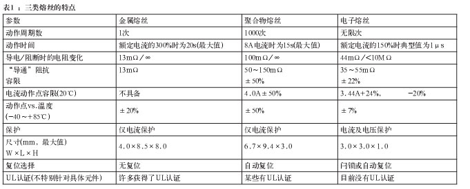 聚合物器件以導電型塑料制成,這些器件在電流(內(nèi)部熱量)達到預設定的電平時會改變它們的阻抗。這些器件也經(jīng)常與TVS器件一起使用,就像金屬熔絲那樣。電子熔絲是半導體電路,控制功率開關(通常是功率MOSFET),并按照預設的參數(shù)改變其阻抗。表1簡單比較了這三類熔絲。