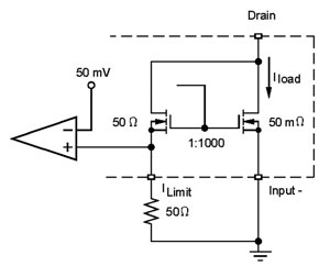 電子熔絲使用SENSEFETTM來開關電源、限制電流及監(jiān)測輸出電流。SENSEFET的優(yōu)勢是僅測量小部分的負載電流。沒有SENSEFET,全部負載電流將要流經(jīng)感測電阻,而這將需要大功率、極低阻抗的電阻。與價格不足1美分的小型片式電阻相比,這些電阻較昂貴。