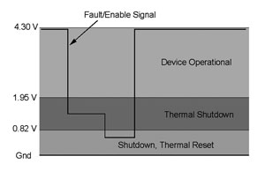 圖5顯示的是這電路的信號電平,而圖6顯示的是等效原理圖。在正常工作中,內(nèi)部電流源將啟用引腳上拉至4.3V。如果發(fā)生熱故障,由于過大直流電流、限流或過壓保護原因,這器件將關閉,熱邏輯將把這信號下拉至1.6V電平。
