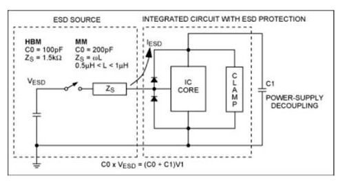 靜電放電強(qiáng)度以電壓形式表示,該電壓由電容的儲(chǔ)能電荷產(chǎn)生,最終傳遞到IC。作用到IC的電壓和電流強(qiáng)度與IC和ESD源之間的阻抗有關(guān)。對(duì)電荷來源進(jìn)行評(píng)估后建立了ESD測試模型。