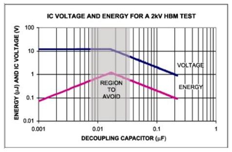 對(duì)于高速雙極型IC,HBM測試中吸收的最大能量是1μJ;2kV人體模式下,如果電容小于0.02μF(圖 6),C1>>C0二極管會(huì)產(chǎn)生動(dòng)作。為了使去耦電容的能量低于1μJ,去耦電容有兩種選擇:要么容值大于0.05μF,要么小于 0.005μF。當(dāng)使用更高的測試電壓時(shí),要按比例增大0.05μF電容的尺寸。