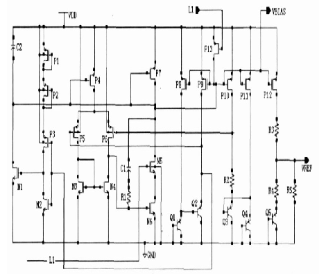 圖1中N1,N2, P1, P2, P3, C1作為啟動(dòng)電路,有源電阻P1, P2 起限流作用。N5, P13 為開(kāi)關(guān)管,當(dāng)保護(hù)電路處于休眠狀態(tài)時(shí),電路必須停止工作,使功耗降為最低,此時(shí)通過(guò)內(nèi)部控制電路使L1 為低電位, P13 管打開(kāi),使偏置點(diǎn)VB IAS上升為高電位,P4, P7, P8, P9 , P10, P11, P12管截止,N5管關(guān)閉,切斷由P13,N6形成的支路,該電路停止工作,電流幾乎為零。經(jīng)仿真,該基準(zhǔn)電路在2. 2V電壓下可正常工作。