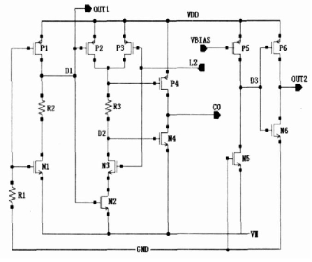 當(dāng)鋰電池由于自放電使自身電壓降為PMOS管閾值以下時(shí), P1管截止, D1為低電位,使N2管截止,節(jié)點(diǎn)D2無(wú)法下降到VM端電壓, P4管截止, CO端為低電位,充電控制用FET2關(guān)閉,禁止充電,即為零伏電池充電禁止功能。在充電過(guò)程中, VM端電位為- I ×2RFET (見(jiàn)圖1) , I為充電電流, RFET為FET導(dǎo)通電阻。當(dāng)電流過(guò)大, 使VM 端電位下降到負(fù)的NMOS閾值以下時(shí),N5管導(dǎo)通, D3電位下降, P6管導(dǎo)通,輸出OUT2為高電位,當(dāng)該狀態(tài)持續(xù)一段時(shí)間以后,控制邏輯判斷該狀態(tài)有效,使L2 為低電位,N3管截止, P3管導(dǎo)通,D2為高電位,使CO端為低,充電控制用FET2關(guān)閉,充電停止,即為充電異常檢測(cè)功能?! ?br />
