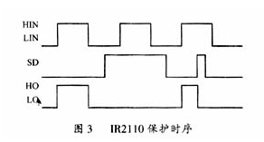 本設(shè)計(jì)逆變器為半橋式結(jié)構(gòu),串聯(lián)諧振負(fù)載,驅(qū)動(dòng)采用IR公司的IR2110半橋驅(qū)動(dòng)芯片。IR2110電路簡單,成本低,適用于中大功率IGBT,實(shí)驗(yàn)結(jié)果也驗(yàn)證了IR2110驅(qū)動(dòng)中大功率IGBT的可行性。IR2110芯片有一個(gè)封鎖兩路驅(qū)動(dòng)的SD輸入端,當(dāng)此引腳為高電平時(shí),立刻封鎖兩路輸出,如圖3所示。