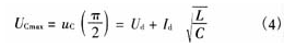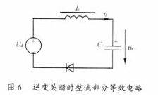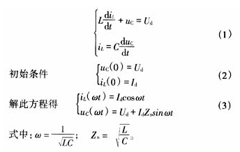 假設(shè)逆變關(guān)斷時(shí)濾波電感中的電流全部從電容C中流過,同時(shí)整流器繼續(xù)輸出電壓Ud。圖6給出了等效電路,L與C串聯(lián)諧振,由于整流橋電流只能單向流通,所以振蕩到T/4時(shí)結(jié)束。
