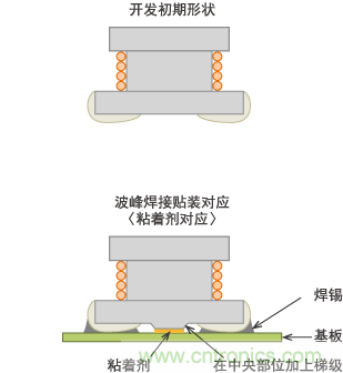在 生產(chǎn)第一代LQN5N及第二代LQH32M時(shí),雖會(huì)對(duì)部分混合IC基板進(jìn)行回流焊接,但一般是對(duì)裝有插腳零部件的基板背面進(jìn)行波峰焊接。其貼裝方法是將膠 粘劑涂在基板焊盤(pán)的中央部或貼片元件電極的中央部,待其固化后將其投入波峰焊接槽。與CR貼片元件相比,體積較大的LQH系列在受到焊錫流動(dòng)阻力后易發(fā)生 脫落,因此在電極間中央部位設(shè)計(jì)了突起(稱為梯級(jí)磁芯)?,F(xiàn)在看來(lái)的話,是反向支架形狀。至今再也見(jiàn)不到這種結(jié)構(gòu)。