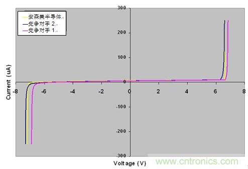 當對以上器件的DC性能進行比較的時候,結(jié)果看起來似乎是相同的(參見圖2所示曲線)。此外,它們都聲稱符合IEC61000-4-2第4級標準,這就意味 著它們將都經(jīng)受住高達8 kV接觸電壓的ESD沖擊。確保保護敏感IC的ESD保護器件至關重要的性能不是DC性能; 盡管器件符合IEC61000-4-2的第4級標準是重要,但更重要的是保護IC。為確保在ESD事件期間IC沒有被損壞,保護二極管必須把ESD電壓鉗 位至足夠低的值,使IC不會損壞。
