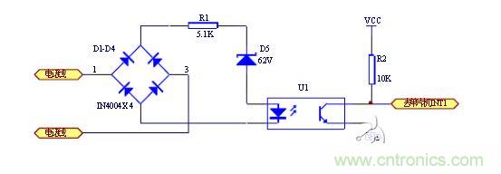 當(dāng)沒有振鈴信號(hào)時(shí),線路上的供電電壓為48V(部分交換機(jī)為60V),經(jīng)四個(gè)二極管構(gòu)成的全橋整流后,不足以使62V穩(wěn)壓管導(dǎo)通,振鈴信號(hào)輸出端電壓接近0V,當(dāng)振鈴信號(hào)到來時(shí),線路上的90V交流振鈴信號(hào)經(jīng)全橋整流變換后90V的脈動(dòng)直流電,其峰值足以擊穿耐壓值為62V穩(wěn)壓管,經(jīng)電阻R1給U1提供電壓,從光電耦合器輸出的波形是 時(shí)通時(shí)斷的方波方波信號(hào),可以直接輸出至單片機(jī)的中斷輸入口, CPU可以根據(jù)振鈴信號(hào)光電轉(zhuǎn)換后的高低電平檢測有無振鈴。