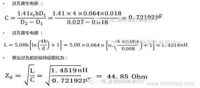 此公式是將過(guò)孔等效為傳輸線的模型來(lái)計(jì)算的,如果常規(guī)我們單端信號(hào)是50歐姆的特征阻抗,過(guò)孔的阻抗如上計(jì)算約為45歐姆,拉低了整體的特征阻抗,所以說(shuō)呈現(xiàn)容性效應(yīng)。