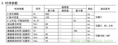 也許你還注意到了上面有許多關(guān)于時間的標(biāo)注,這也是個十分重要的信息,這些時間的標(biāo)注表明了某些狀態(tài)所要維持的最短或最長時間。因為器件的工作速度也是有限的,一般都跟不上主控芯片的速度,所以它們直接之間要有時序配合。話說現(xiàn)在各種處理器的主頻也是瘋狂增長,日后搞不好出現(xiàn)個雙核單片機也不一定就是夢話。下面是時序參數(shù)表: