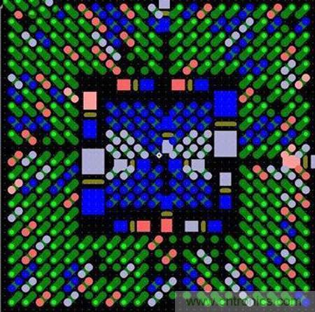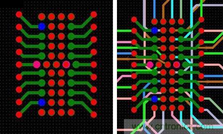 圖6:這種扇出方法避免了使用高端技術(shù),而且不會影響信號完整性。BGA引腳分成內(nèi)部引腳和外部引腳兩部分。