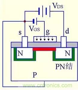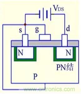 (1) VGS=0時,不管VDS極性如何,其中總有一個PN結(jié)反偏,所以不存在導電溝道。