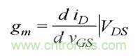 在轉(zhuǎn)移特性曲線上,gm 是曲線在某點上的斜率,也可由iD的表達式求導得出,單位為 S 或 mS。
