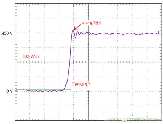 2.如通過優(yōu)化的驅(qū)動(dòng)器設(shè)計(jì)的GaN開關(guān)波形所證明的,GaN可以非常高速的轉(zhuǎn)換速率工作,并且使交換節(jié)點(diǎn)上的振鈴最小。