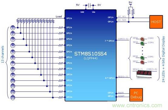 電磁爐是采用磁場感應(yīng)電流的加熱原理對(duì)食物進(jìn)行加熱。加熱時(shí),通過面板下方的線圈產(chǎn)生強(qiáng)磁場,磁力線穿過導(dǎo)磁體做的鍋的底部時(shí),鍋具切割交變磁力線而在鍋具底部產(chǎn)生渦流使鍋底迅速發(fā)熱,達(dá)到加熱食物的目的。在本解決方案中采用44pin的STM8S105S4做按鍵顯示板的主控芯片,控制13個(gè)按鍵的掃描、24個(gè)LED及一個(gè)4位數(shù)碼管的顯示、I2C與主板的通訊,并留有一個(gè)SWIM接口方便工程師調(diào)試之用(如圖2)。