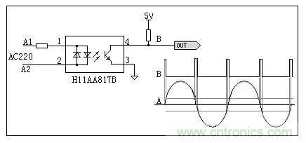 過零點(diǎn)檢測可采用硬件實(shí)現(xiàn),在硬件設(shè)計(jì)中,可以增加如圖4 或圖5過零點(diǎn)的硬件檢測電路,通過在B端輸出為高電平時(shí)進(jìn)行按鍵狀態(tài)的判斷,以期在電磁輻射最小的時(shí)候?qū)τ|摸按鍵進(jìn)行檢測。