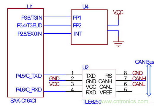 C164CI 與方向盤轉角傳感器的接口電路如圖2所示。片內內置增量編碼的正交解碼器,該解碼器使用定時器3的兩個引腳(T3IN、T3EUD)作為正交脈沖的輸入,在正確設置相關寄存器后,定時器3的數(shù)據(jù)寄存器的值與方向盤轉角成正比,故可方便的計算轉角,本文所使用的方向盤轉角傳感器每一圈對應44個脈沖,設定時器3的數(shù)據(jù)寄存器為T3,則絕對轉角為。
