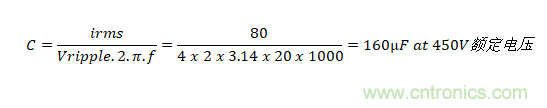 如果僅需要電容器來(lái)控制電動(dòng)汽車動(dòng)力系統(tǒng)等直流線路上的紋波電壓,則在選擇電容器時(shí)將會(huì)呈現(xiàn)顯著不同。 總線電壓可能與以前一樣為400V,但由采用電池供電,因此不存在穿越需求。在下游轉(zhuǎn)換器以20kHz的開關(guān)頻率提取80Arms脈沖電流時(shí),將紋波限制在4Vrms以內(nèi)是非?,F(xiàn)實(shí)的, 所需的電容是: