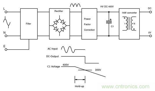圖1:電容器用作停電穿越的能量存儲(chǔ)。