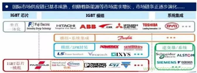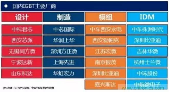 從公司來(lái)看,國(guó)外研發(fā)IGBT器件的公司主要有英飛凌、 ABB、三菱、西門(mén)康、東芝、富士等。中國(guó)功率半導(dǎo)體市場(chǎng)占世界市場(chǎng)的50%以上,但在中高端MOSFET及IGBT主流器件市場(chǎng)上,90%主要依賴進(jìn)口,基本被國(guó)外歐美、日本企業(yè)壟斷。