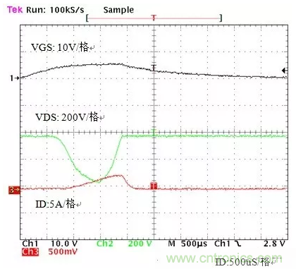 輸入端305Vac、220Vac進(jìn)行打火測(cè)試,滿載情況下,電感電流會(huì)進(jìn)入連續(xù)模式狀態(tài),MOSFET失效。