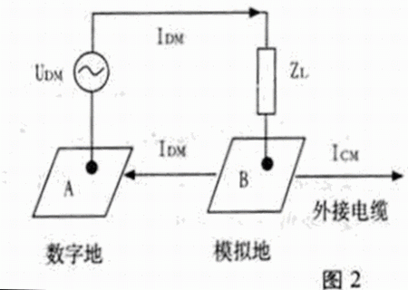 例1:在印制電路板上為了把數(shù)字部分和模擬部分隔離,常把地分割成數(shù)字地和模擬地。如果這兩部分之間有信號聯(lián)系,如圖2所示,并且數(shù)字地和模擬地的連接部分AB比較細長,存在一定電感,則差模電流IDM將在AB連接線的電感上產(chǎn)生共模驅(qū)動電壓源,從而引起共模輻射,天線一部分是數(shù)字地,另一部分是模擬地和外接地線。