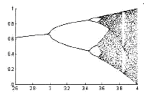 時(shí)系統(tǒng)分別產(chǎn)生周期2和周期4不動(dòng)點(diǎn)。系統(tǒng)發(fā)生混沌的臨界值