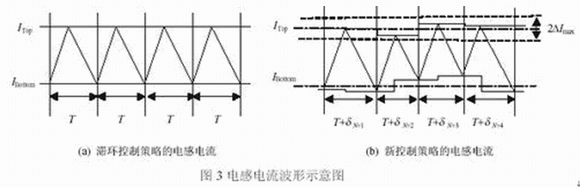[page] 如圖2所示為一種常見的DC/DC控制策略——滯環(huán)控制策略。該控制策略限定了電感電流波動(dòng)的最大值ITop和最小值Ibotton,電感電流波形如圖3a所示。此時(shí),電感電流為周期的,變換器有固定的開關(guān)周期T。設(shè)電感電流為ILp(t),則