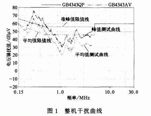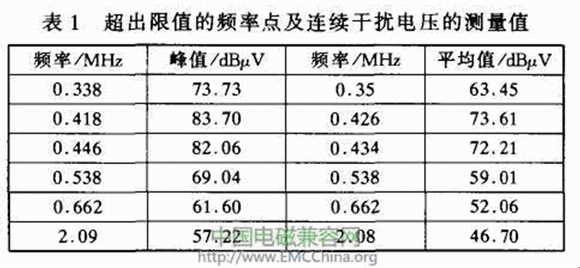 圖1是某一臺空調(diào)產(chǎn)品連續(xù)干擾電壓的測試曲線(執(zhí)行GtM343.1—2003《家用和類似用途電動、電熱器具,電動工具以及類似電器無線電干擾特性測量方法和允許值》l11)。表1是超出限值的一些頻率點(diǎn)及連續(xù)干擾電壓的峰值和平均值的測量值。