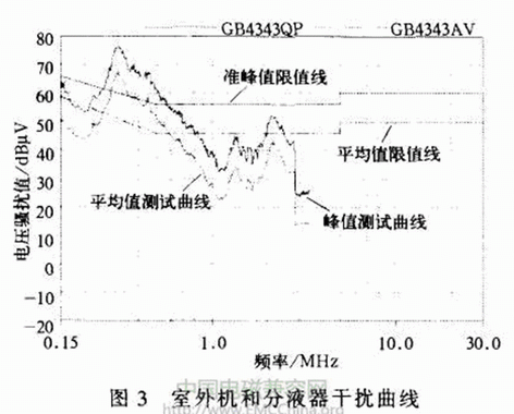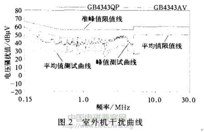 從圖2可以看出,測量的連續(xù)干擾電壓的峰值曲線和平均值曲線均沒有超過限值線,且有一定的裕量,由此可以排除室外機(jī)控制器和壓縮機(jī)干擾的可能。
