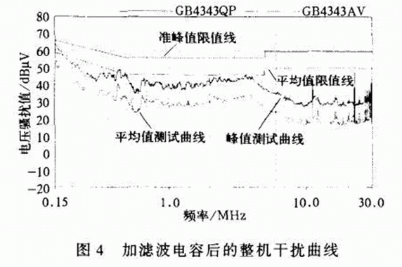 由圖4和表2可以看出,在加了濾波電容后,超出限值線的干擾均被濾掉。在實(shí)際應(yīng)用中,單一的電容器不可能在從低頻段到高頻段都能令人滿意。這種情況下可以將兩個不同類型的電容器并聯(lián)使用,會取得良好的效果。