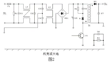 圖1 是一個(gè)普遍應(yīng)用的反激式(或稱(chēng)為回掃式)開(kāi)關(guān)電源工作原理圖,50Hz 或60Hz 交流電網(wǎng)電壓首先經(jīng)整流堆整流,并向儲(chǔ)能濾波電容器C5 充電,然后向變壓器T1與開(kāi)關(guān)管V1組成的負(fù)載回路供電。圖2 是進(jìn)行過(guò)電磁兼容設(shè)計(jì)后的電原理圖。