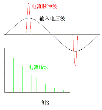 一般電容器C5 的容量很大,其兩端電壓紋波很小,大約只有輸入電壓的10%左右,而僅當(dāng)輸入電壓Ui大于電容器C5 兩端電壓的時(shí)候,整流二極管才導(dǎo)通,因此在輸入電壓的一個(gè)周期內(nèi),整流二極管的導(dǎo)通時(shí)間很短,即導(dǎo)通角很小。這樣整流電路中將出現(xiàn)脈沖尖峰電流,如圖3 所示。