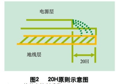 為了減小電源的邊緣輻射,電源/地平面應(yīng)遵循20H設(shè)計原則,即地平面尺寸比電源平面尺寸大20H(見圖2),這樣邊緣場輻射強(qiáng)度可下降70% 。