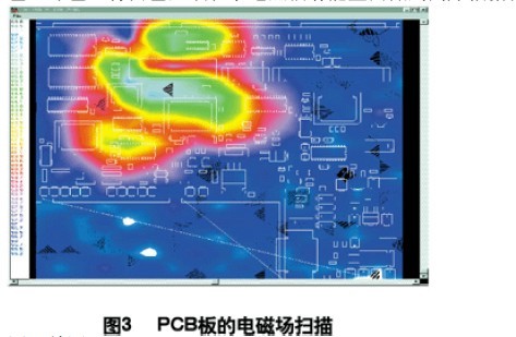 利用電磁輻射掃描儀,對裝聯(lián)并上電后的機(jī)盤掃描,得到PCB中電磁場分布圖(如圖3,圖中紅色、綠色、青白色區(qū)域表示電磁輻射能量由低到高),根據(jù)測試結(jié)果改進(jìn)PCB設(shè)計。