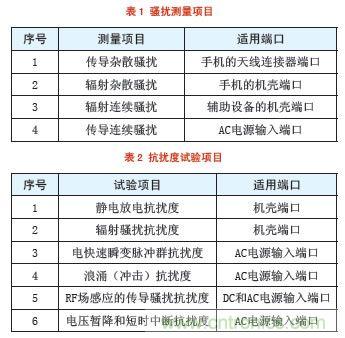 雖然手機的制式不同,但是電磁兼容要測試的項目相同,根據(jù)不同的要求來選擇需要測試的項目,電磁兼容測試項目見表1和表2。