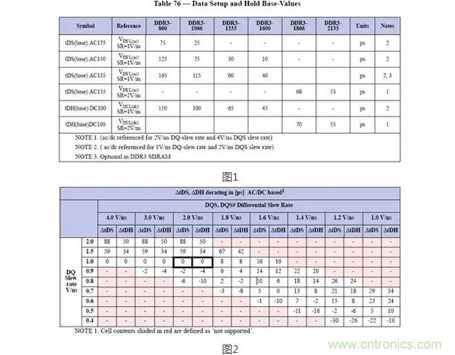 以DDR3信號為例,在JEDEC規(guī)范中規(guī)定了一個建立保持時間的基準(zhǔn)值(圖1),還有就是derating值(圖2),兩者之和就是所需的建立保持時間。