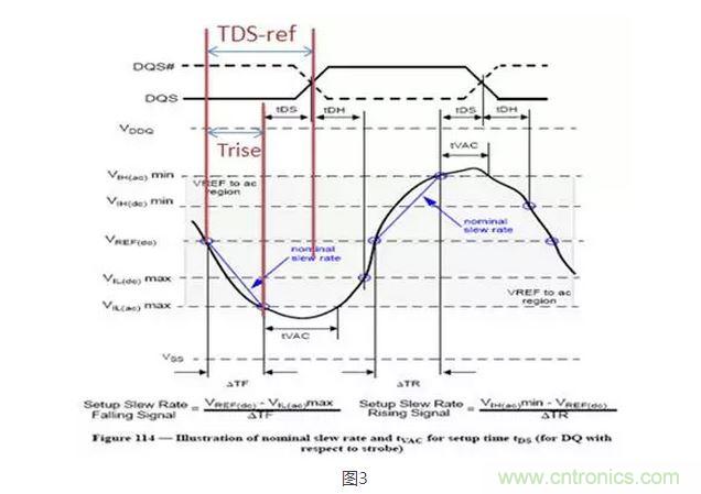 如圖3,建立時間等于TDS-ref(在ref處的建立時間)減去Trise(Vref到VIH AC的時間)。規(guī)范中的基準(zhǔn)值是預(yù)減去了這個Trise的,這個預(yù)減去的值是特定slew rate為1V/ns時的值,若判斷門限是AC175,則預(yù)減去175ps。請再看圖2,當(dāng)slew rate等于1V/ns時,derating為0,不需要調(diào)整;當(dāng)slew rate大于1V/ns(更快)時,從Vref到Vih(ac)所需的時間就少,預(yù)減多了,要補回來,所以取值為正;當(dāng)slew rate小于1V/ns(更慢)時就預(yù)減少了,所以取值為負(fù)。從圖2中的取值關(guān)系推導(dǎo)出取值公式為Derating @AC175 = 175ps - 175mV/SR,大家可以代入計算一下試試。如果判斷門限是AC150或其他都可以套用。而保持時間是DC門限,其公式為Derating @DC100 = 100ps - 100mV/SR。