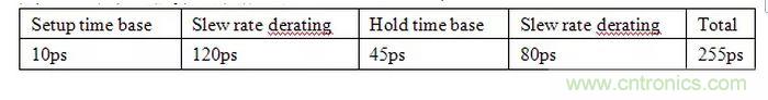 簡單,可以用上面的公式計算出derating值,但上述公式只適用于>1v/ns的情況。然后和基準(zhǔn)值相加得到總的建立保持時間,如下表,總共所需的建立保持時間的總和是255ps。這樣就可以準(zhǔn)確的估算時序裕量了。