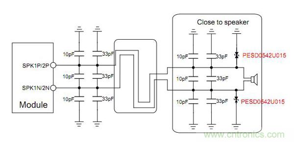 對(duì)于揚(yáng)聲器的靜電保護(hù),可以采用0402或0201的超低電容 ESD器件PESD0542U015,可以節(jié)約布板空間,且因?yàn)?.05PF的電容,可以保證此模擬信號(hào)的完整傳輸。
