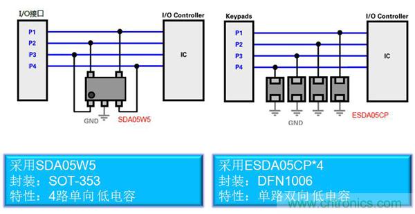 對(duì)于普通的IO口的靜電防護(hù),因?yàn)槠渌俾瘦^低,采用普通的TVS器件即可滿足8KV的防護(hù)需求。