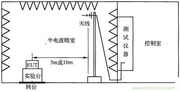 圖1所示是根據(jù)CISPR16、CISPR11、CISPR13、CISPR15、CISPR22及EN55022等標準要求的輻射發(fā)射測試布置圖,輻射發(fā)射測試時,被測設(shè)備(EUT)置于半電波暗室內(nèi)部,在轉(zhuǎn)臺上旋轉(zhuǎn),在接收天線分別處于垂直極化和水平極化的情況下,找到最大的輻射點。輻射信號由接收天線接收后,通過電纜傳到半電波暗室外的接收機。